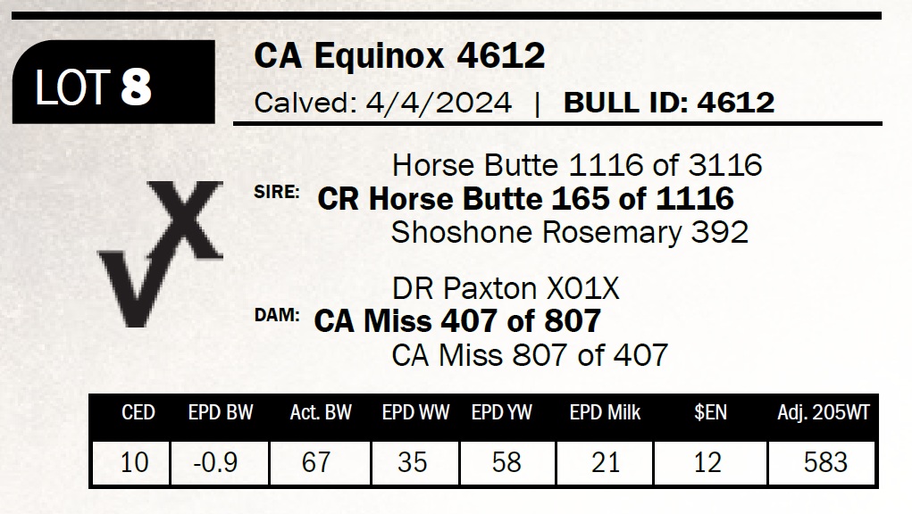 | CA Equinox 4612 | 8 | Two-Year Old Bull | Sells Commercial. Big, soggy, deep-bodied bull with plenty of volume–true cow-making type. |