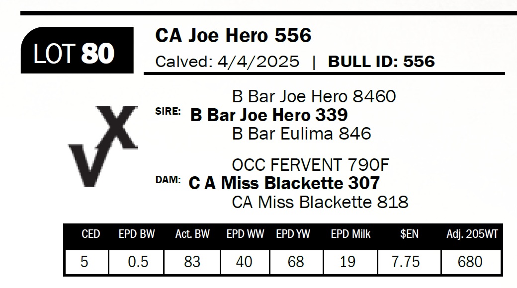 | CA Joe Hero 556 | 80 | Yearling Bull | ** Calving Ease. Straight, nice Angus head, good hindquarter–possible heifer bull for larger heifers. |