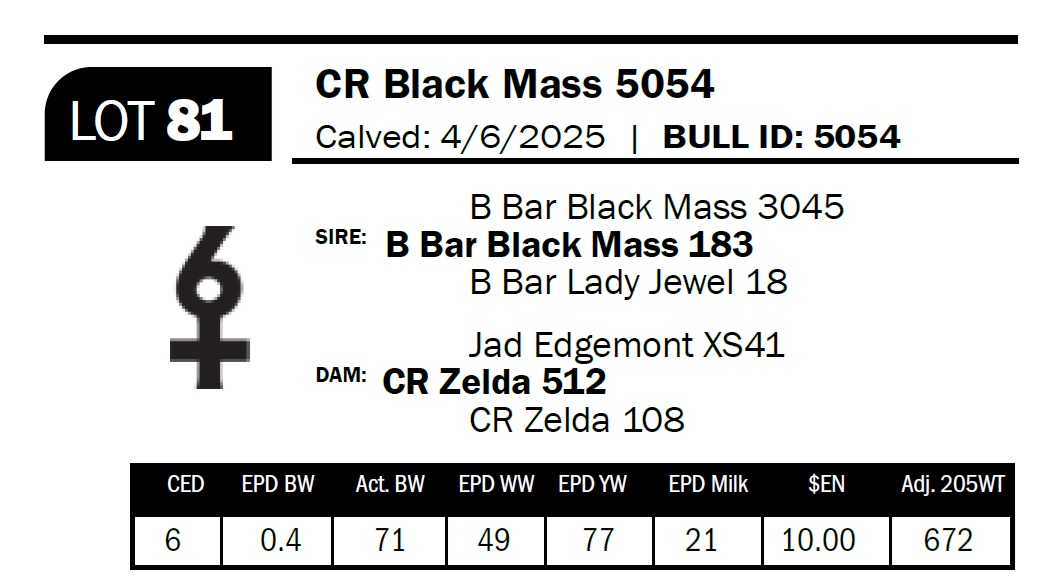 | CR Black Mass 5054 | 81 | Yearling Bull | *** Calving ease. Nice bull with length, scale, and substance. Possible heifer bull for bigger heifers; sired by 18 Black Mass, who worked on heifers. |