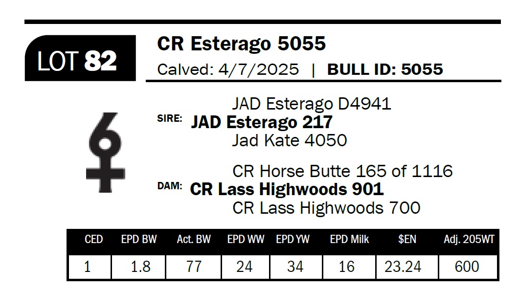 | CR Esterago 5055 | 82 | Yearling Bull | Shoshone-bred cow bull with length, depth, and strong bone throughout. |