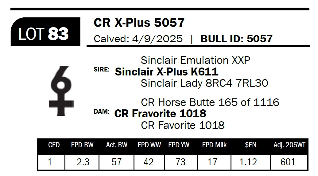 | CR X-Plus 5057 | 83 | Yearling Bull | Here is a bull that should do an outstanding job producing females while siring strong, stout calves that add extra punch come fall. |