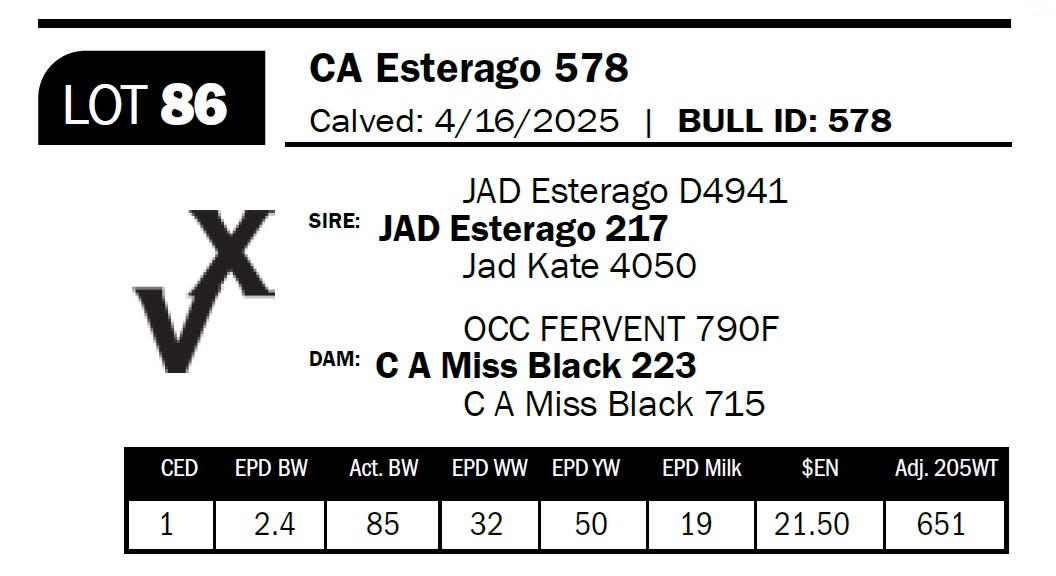 | CA Esterago 578 | 86 | Yearling Bull | Straight, thick, and deep-bodied cow bull with a wellmuscled hindquarter. |