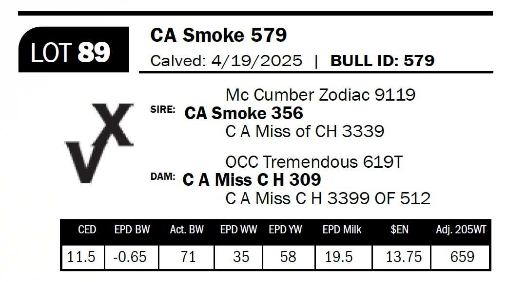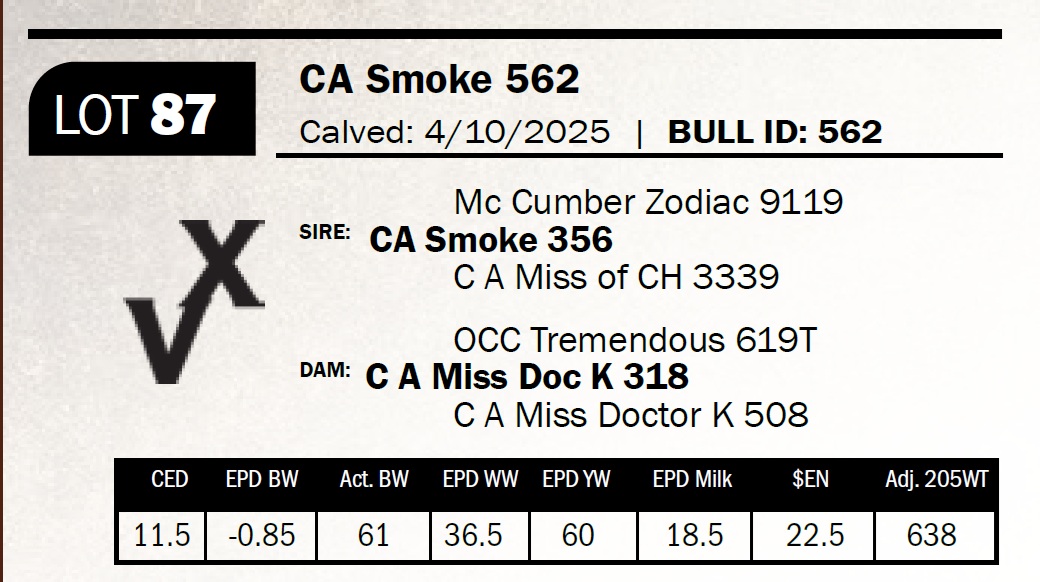 | CA Smoke 562 | 87 | Yearling Bull | *** Calving ease. Sired by our home-raised Smoke bull, this smooth, correct bull is a true heifer bull deluxe. |