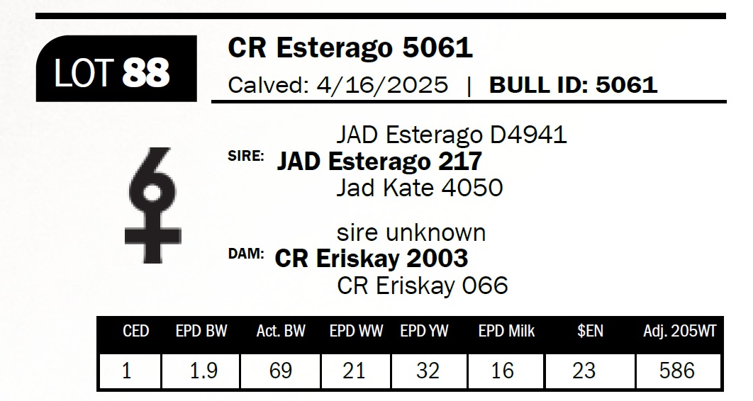 | CR Esterago 5061 | 88 | Yearling Bull | Sells commercial. Structurally straight and correct 217 son out of a nice young cow. |