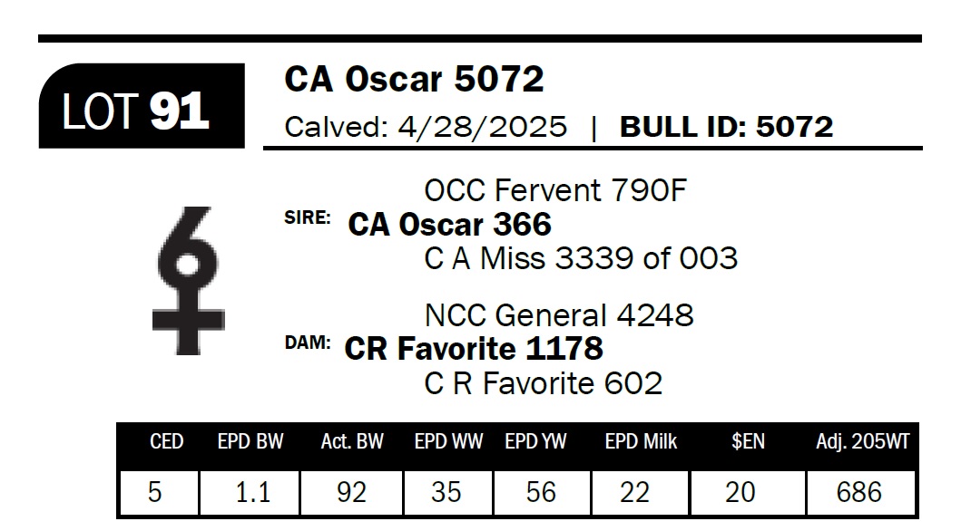 | CA Oscar 5072 | 91 | Yearling Bull | Deep, massive cow bull sired by home-raised CA Oscar with exceptional volume. Paternal granddam, 003, is a proven 15-year-old Homer daughter who we fl ushed. |
