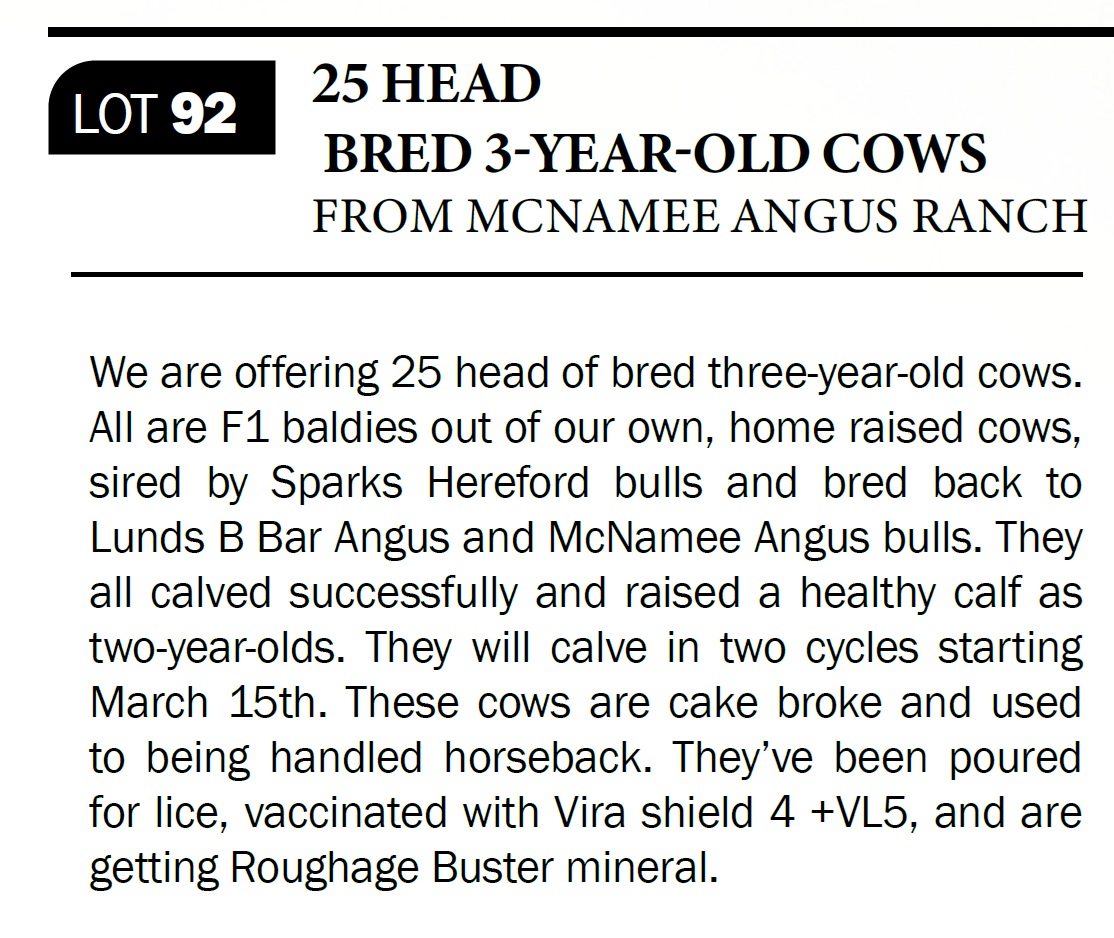 | 25 HEAD BRED 3-YEAR-OLD COWS | 92 | 25 Head 3 Yr Old Bred Cows - NO VIDEO ON THIS LOT! | We are offering 25 head of bred three-year-old cows. All are F1 baldies out of our own, home raised cows, sired by Sparks Hereford bulls and bred back to Lunds B Bar Angus and McNamee Angus bulls. They all calved successfully and raised a healthy calf as two-year-olds. They will calve in two cycles starting March 15th. These cows are cake broke and used to being handled horseback. They’ve been poured for lice, vaccinated with Vira shield 4 +VL5, and are getting Roughage Buster mineral. |