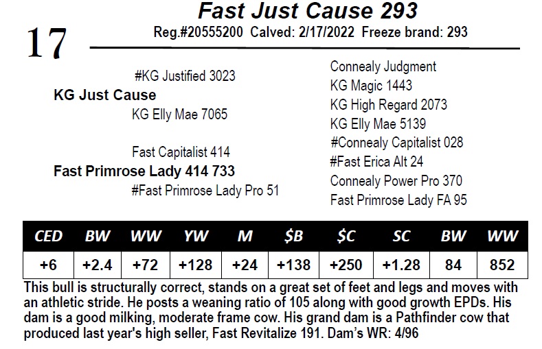 | Fast Justified 4117 | 54 | Fast Angus - Yearling Bull | A bull with a long spine, a wide top and good depth of rib.*His dam is the mother of Fast Cha-Ching 97, a picture perfect Angus cow for phenotype, sound feet and legs, and a quality shaped udder. *His Carcass EPDs: Marb: +.61, RE: +.45. His WR: 105, Dam’s WR: 5/107. |
