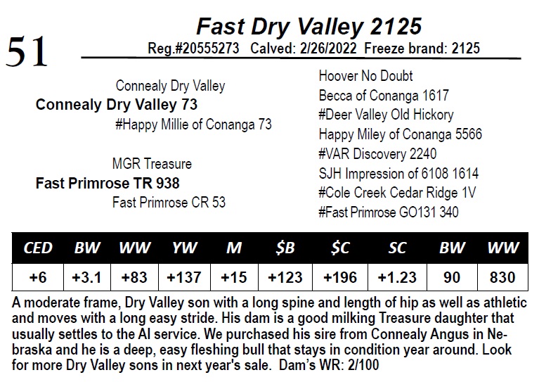 | Fast Dry Valley 4115 | 46 | Fast Angus - Yearling Bull | A moderate frame, thick, long bodied Dry Valley son with sound feet and legs. *Dam is heavy milking cow Pathfinder cow. *His Carcass EPDs: Marb: +.56, RE: +.16. His WR: 104. Dam’s WR: 5/105. |