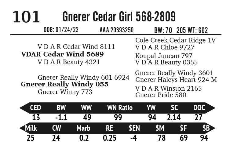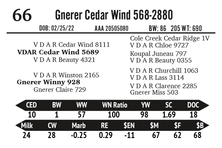 | Gnerer Cedar Wind 3039 | 142 | Gnerner Angus | 2- Year Old Bull |