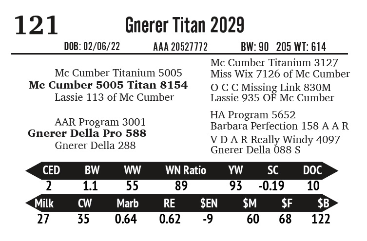 | Gnerer Duke 4029 | 121 | Gnerner Angus | Yearling Bull |