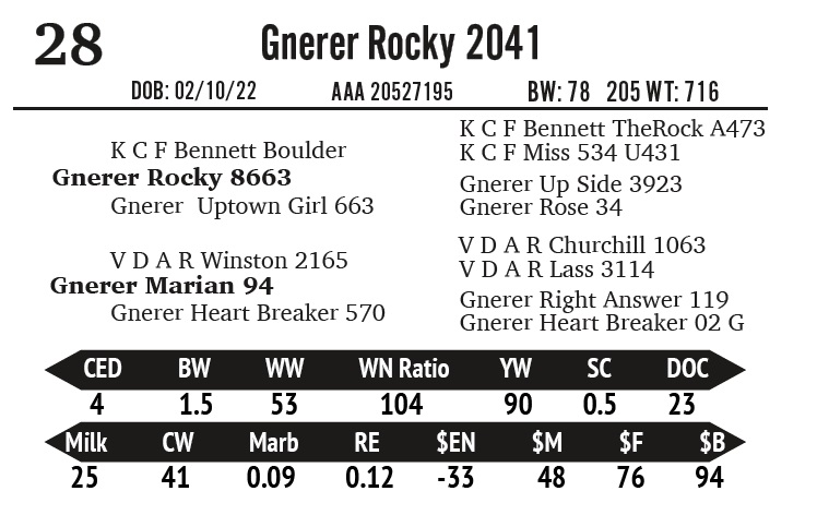 | Gnerer 866 Rocky 468 | 5 | Gnerner Angus | Yearling Bull |