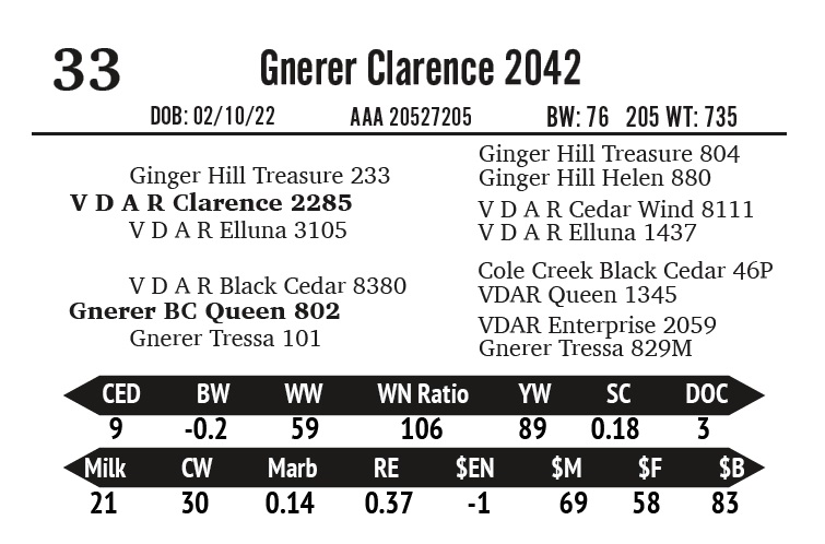 | Gnerer 972 Clarence 4092 | 71 | Gnerner Angus | Yearling Bull |