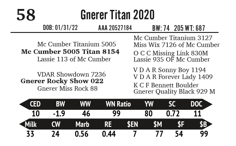 | Gnerer Bravo 4038 | 55 | Gnerner Angus | Yearling Bull |