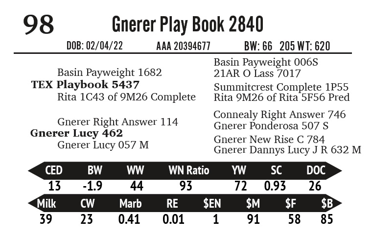 | Gnerer PlayBook 118-3899 | 148 | Gnerner Angus | 2- Year Old Bull |