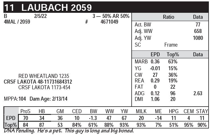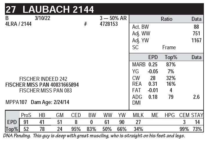 | LAUBACH PLATINUM 3097 | 23 | Registered Red Angus Bull | He packs a punch. |