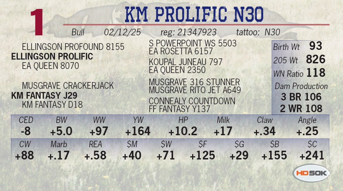 | KM PROLIFIC N30 | 1 | Yearling Bull | Lot 1 starts the sale with a bull that checks all of the boxes. He is a prime example of what we strive for as registered seed stock producers. • Since birth, he demands your attention as he strides out on a strong foot. He’s got a beautiful square hip and carries his muscle mass down to his lower 1/3. • His mother is earning her way to the donor pen, just as his grandmother, D18 did, weaning 3 at 110 and staying within her calving interval every year. She is a beautiful cow that adds her attractiveness to this massive Prolific son. • Lot 1 posted one of the highest adj weaning weight in the sale of 826 lbs. Take a look at his EPDs and you’ll see he ranks in the top 2% for weaning weight and carcass weight and the top 3% for yearling weight. He posts a +125 for $F. • Putting all of this together, you’ll realize lot 1 is a cow bull that is going to add weight and carcass to your calves while keeping them sound far into maturity. |