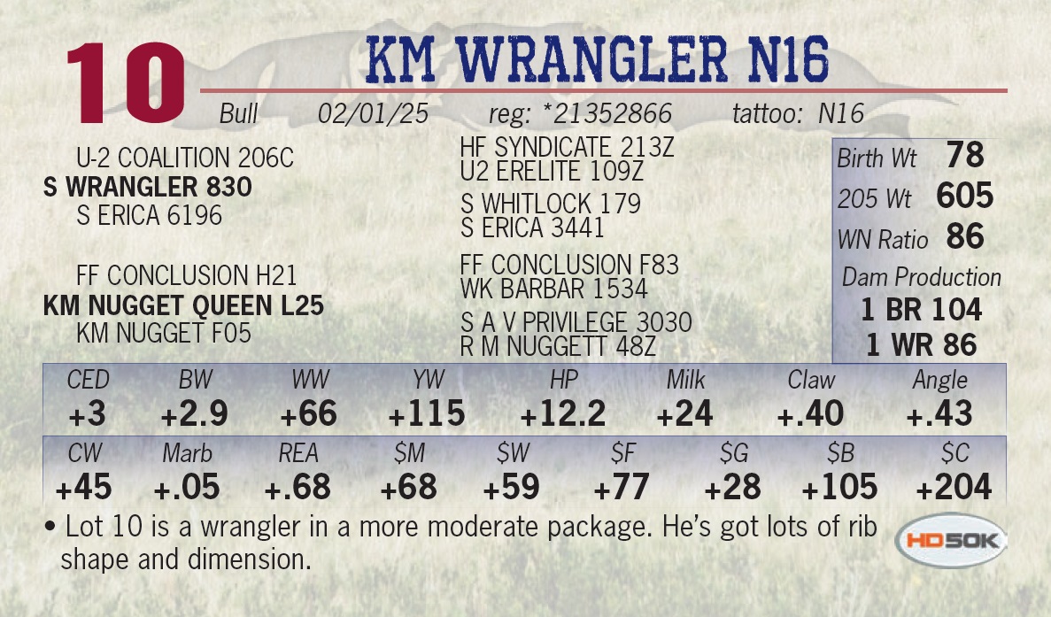| KM WRANGLER N16 | 10 | Yearling Bull | • Lot 10 is a wrangler in a more moderate package. He’s got lots of rib shape and dimension. |
