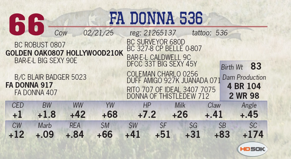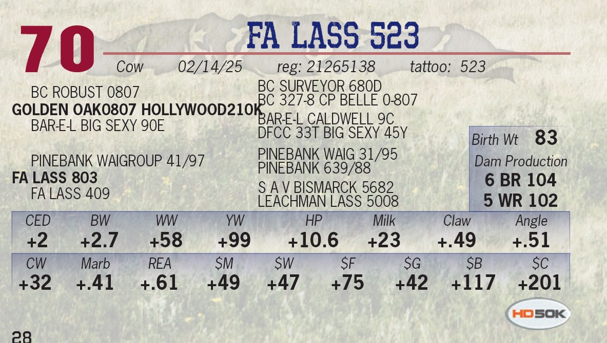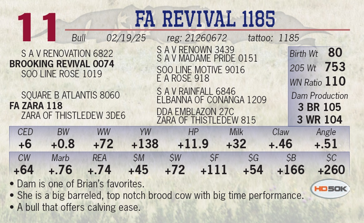 | FA REVIVAL 1185 | 11 | Yearling Bull | • Dam is one of Brian’s favorites. • She is a big barreled, top notch brood cow with big time performance. • A bull that offers calving ease. |