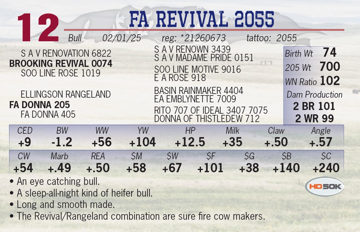 | FA REVIVAL 2055 | 12 | Yearling Bull | • An eye catching bull. • A sleep-all-night kind of heifer bull. • Long and smooth made. • The Revival/Rangeland combination are sure fire cow makers. |