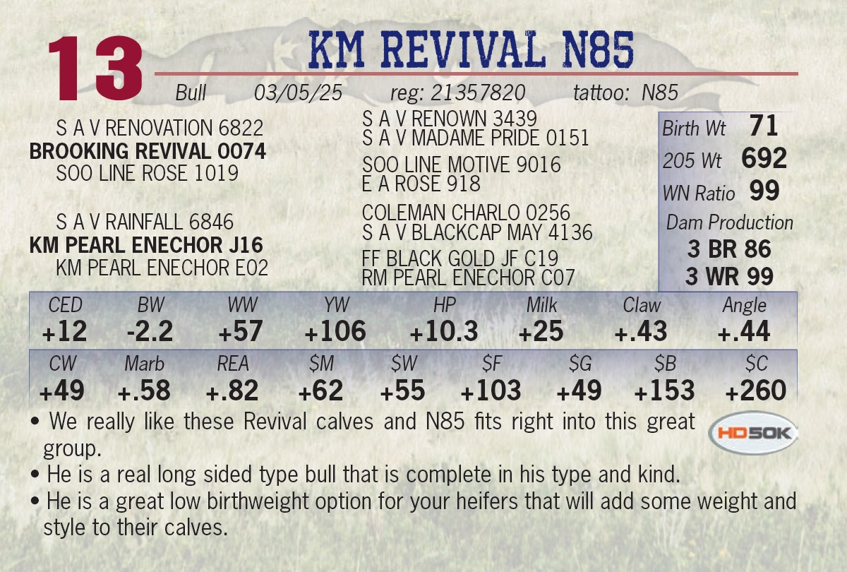 • We really like these Revival calves and N85 fits right into this great group. • He is a real long sided type bull that is complete in his type and kind. • He is a great low birthweight option for your heifers that will add some weight and style to their calves.