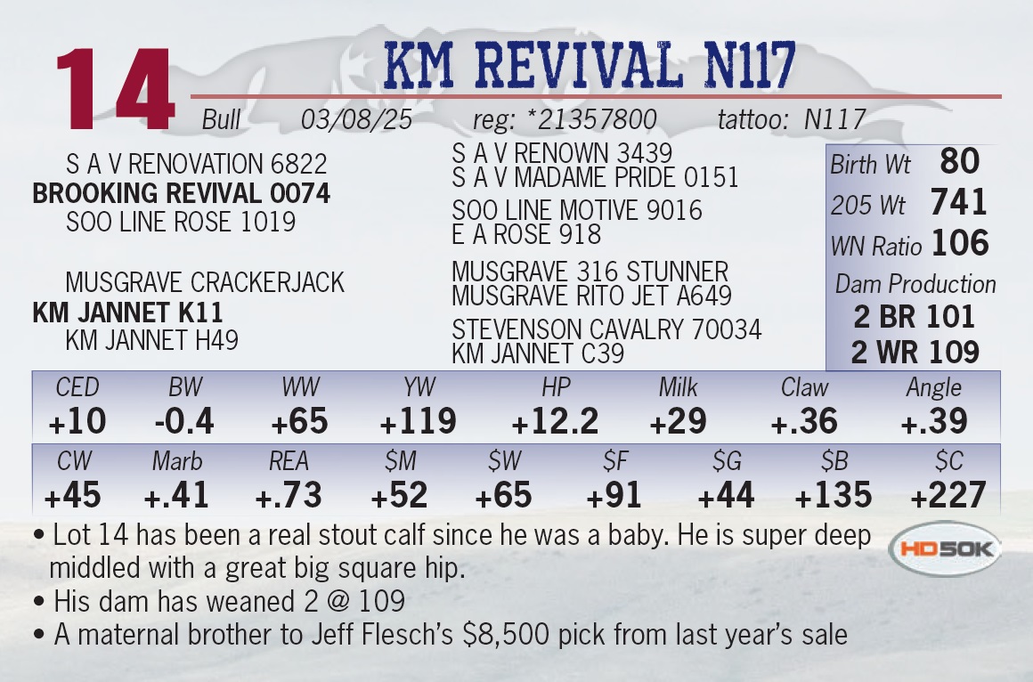 | KM REVIVAL N117 | 14 | Yearling Bull | • Lot 14 has been a real stout calf since he was a baby. He is super deep middled with a great big square hip. • His dam has weaned 2 @ 109 • A maternal brother to Jeff Flesch’s $8,500 pick from last year’s sale |