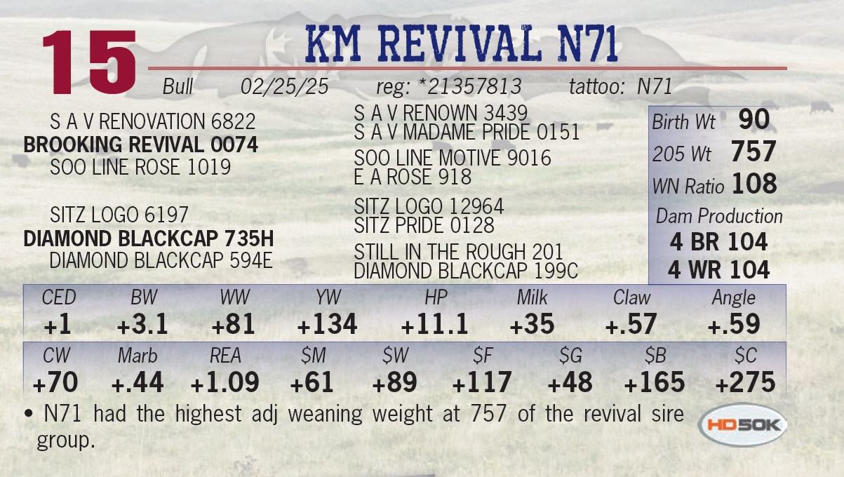 | KM REVIVAL N71 | 15 | Yearling Bull | • N71 had the highest adj weaning weight at 757 of the revival sire group. |