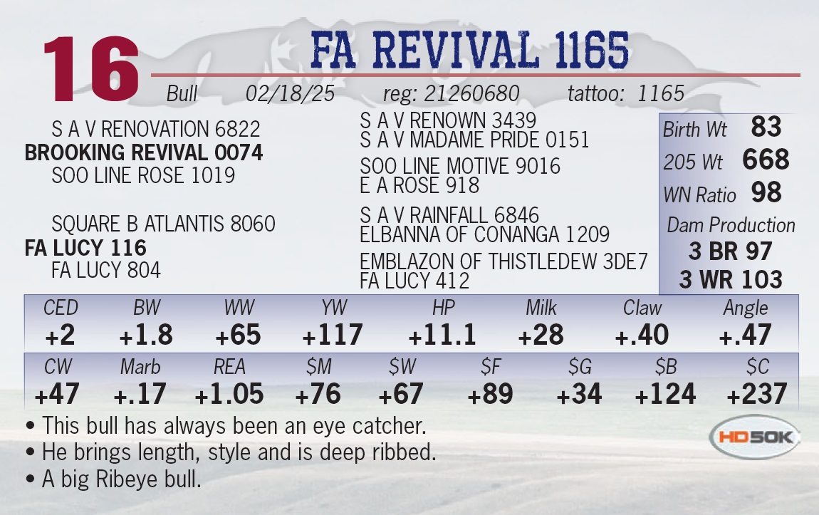 | FA REVIVAL 1165 | 16 | Yearling Bull | • This bull has always been an eye catcher. • He brings length, style and is deep ribbed. • A big Ribeye bull. |