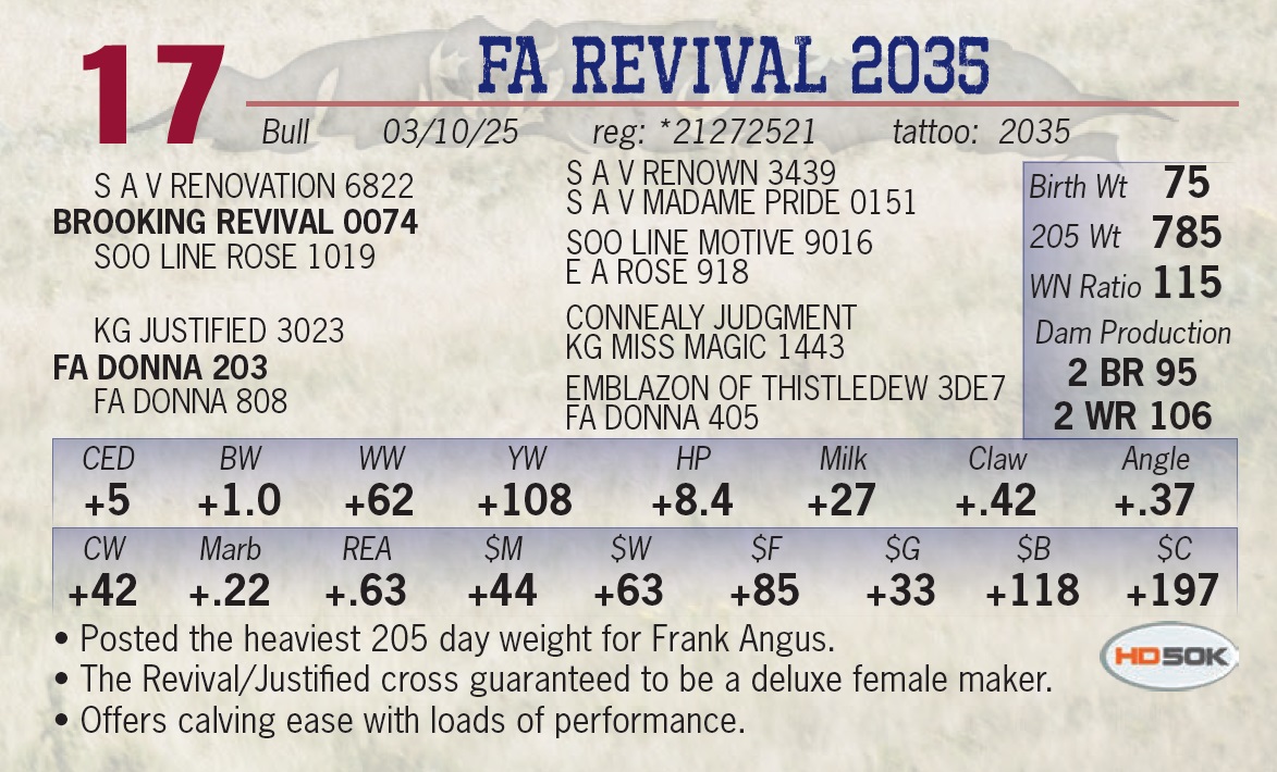 | FA REVIVAL 2035 | 17 | Yearling Bull | • Posted the heaviest 205 day weight for Frank Angus. • The Revival/Justified cross guaranteed to be a deluxe female maker. • Offers calving ease with loads of performance. |