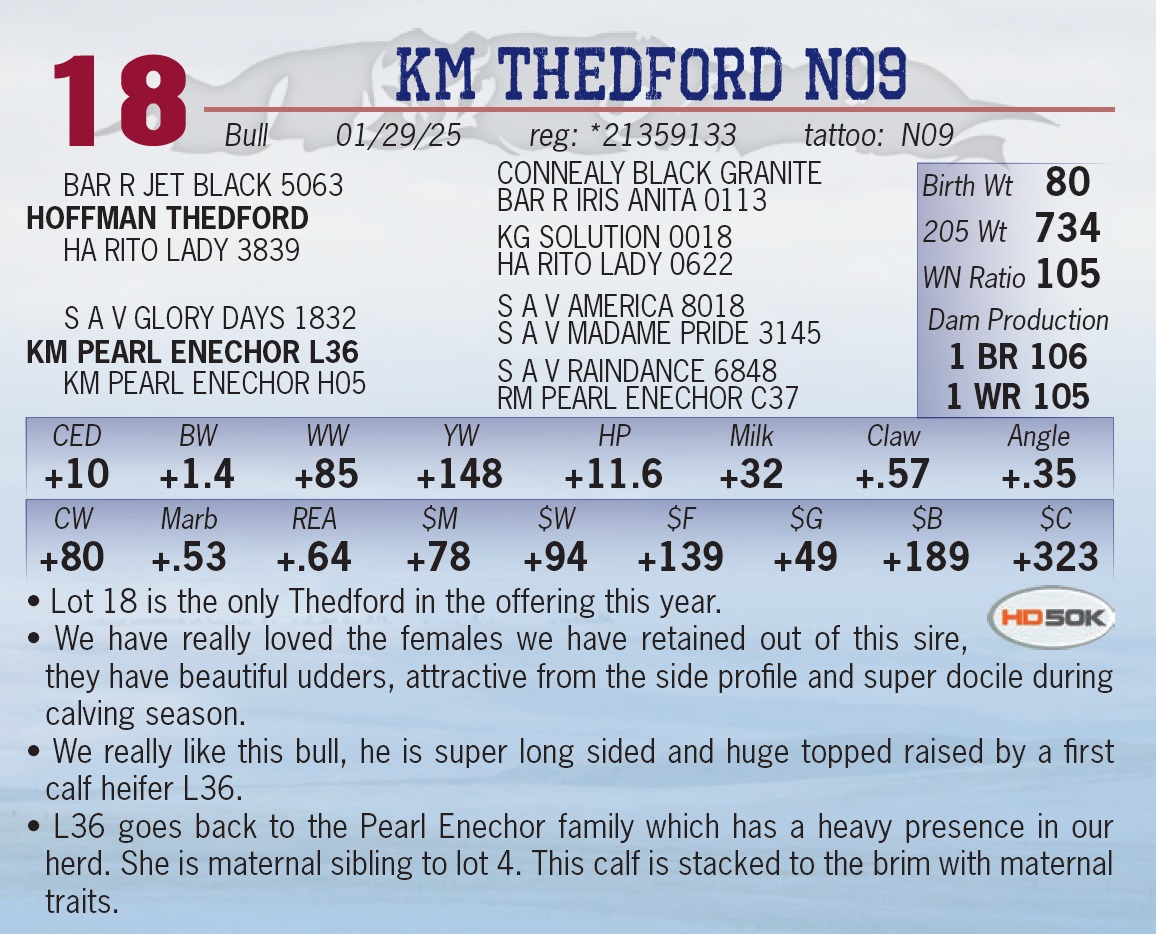 | KM THEDFORD N09 | 18 | Yearling Bull | • Lot 18 is the only Thedford in the offering this year. • We have really loved the females we have retained out of this sire, they have beautiful udders, attractive from the side profile and super docile during calving season. • We really like this bull, he is super long sided and huge topped raised by a first calf heifer L36. • L36 goes back to the Pearl Enechor family which has a heavy presence in our herd. She is maternal sibling to lot 4. This calf is stacked to the brim with maternal traits. |