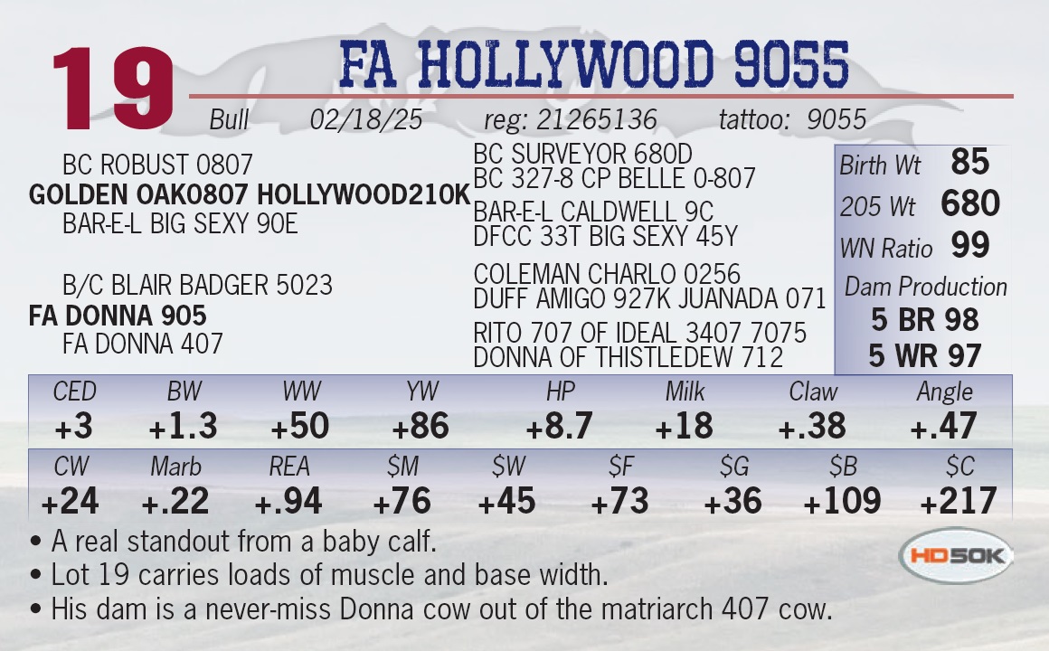| FA HOLLYWOOD 9055 | 19 | Yearling Bull | • A real standout from a baby calf. • Lot 19 carries loads of muscle and base width. • His dam is a never-miss Donna cow out of the matriarch 407 cow. |