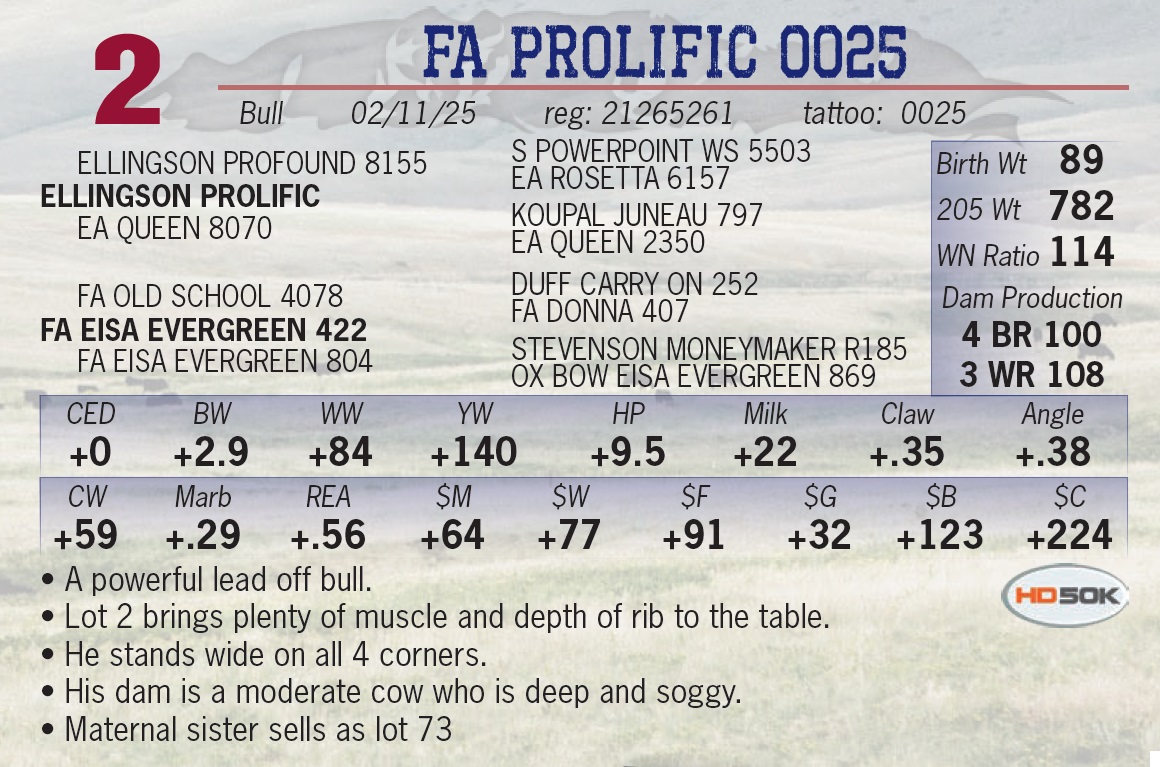 | FA PROLIFIC 0025 | 2 | Yearling Bull | • A powerful lead off bull. • Lot 2 brings plenty of muscle and depth of rib to the table. • He stands wide on all 4 corners. • His dam is a moderate cow who is deep and soggy. • Maternal sister sells as lot 73 |