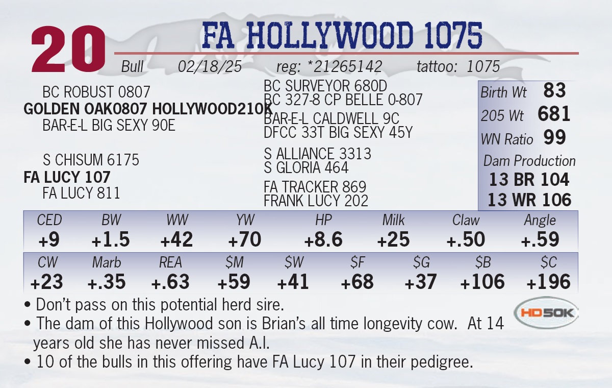| FA HOLLYWOOD 1075 | 20 | Yearling Bull | • Don’t pass on this potential herd sire. • The dam of this Hollywood son is Brian’s all time longevity cow. At 14 years old she has never missed A.I. • 10 of the bulls in this offering have FA Lucy 107 in their pedigree. |