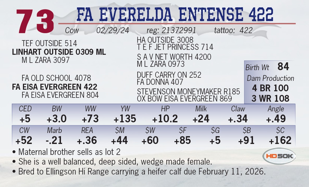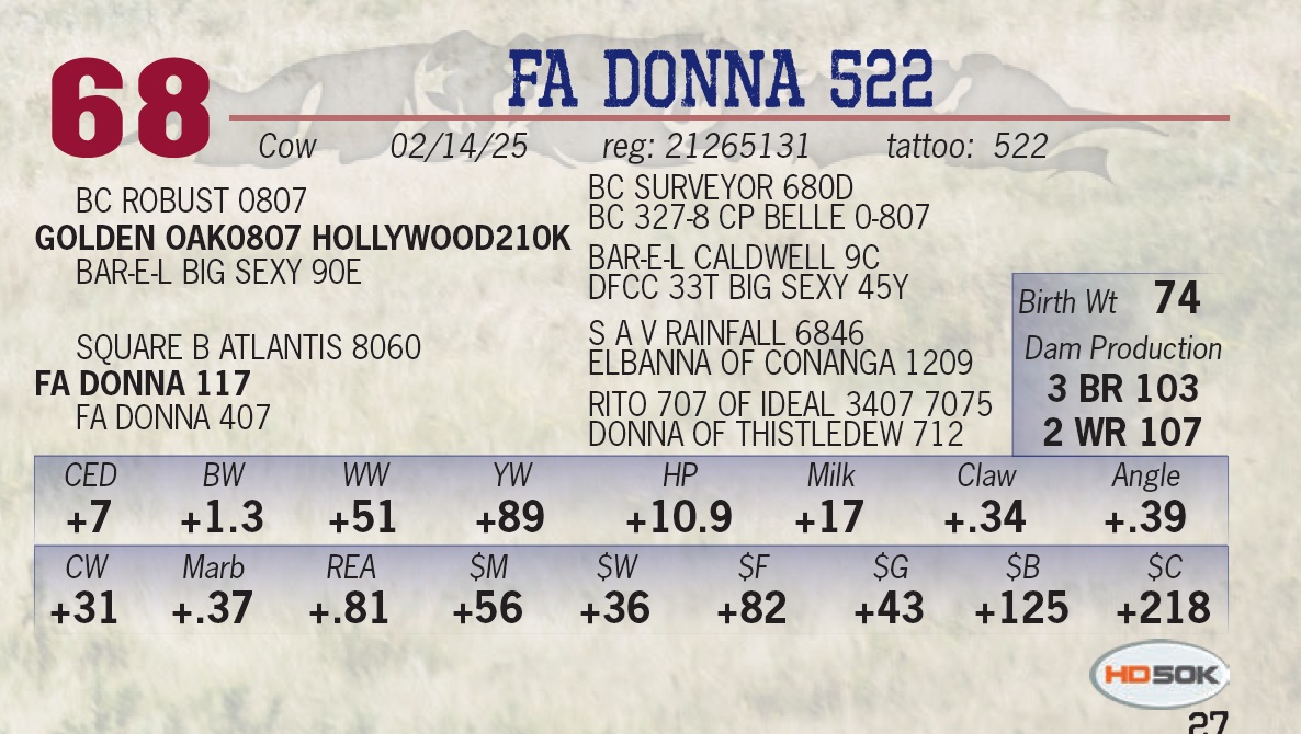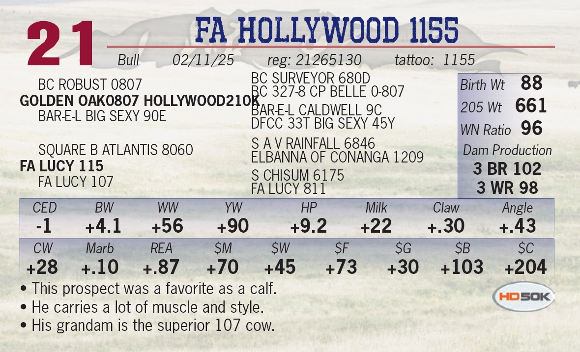 | FA HOLLYWOOD 1155 | 21 | Yearling Bull | • This prospect was a favorite as a calf. • He carries a lot of muscle and style. • His grandam is the superior 107 cow. |