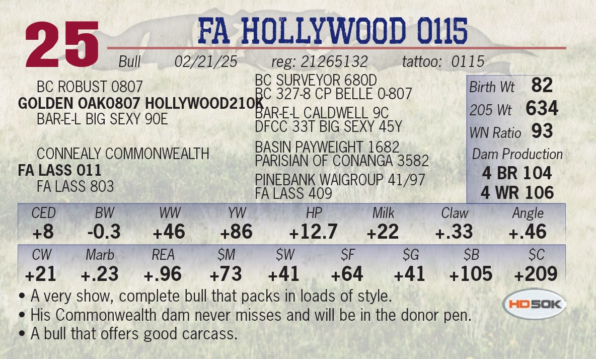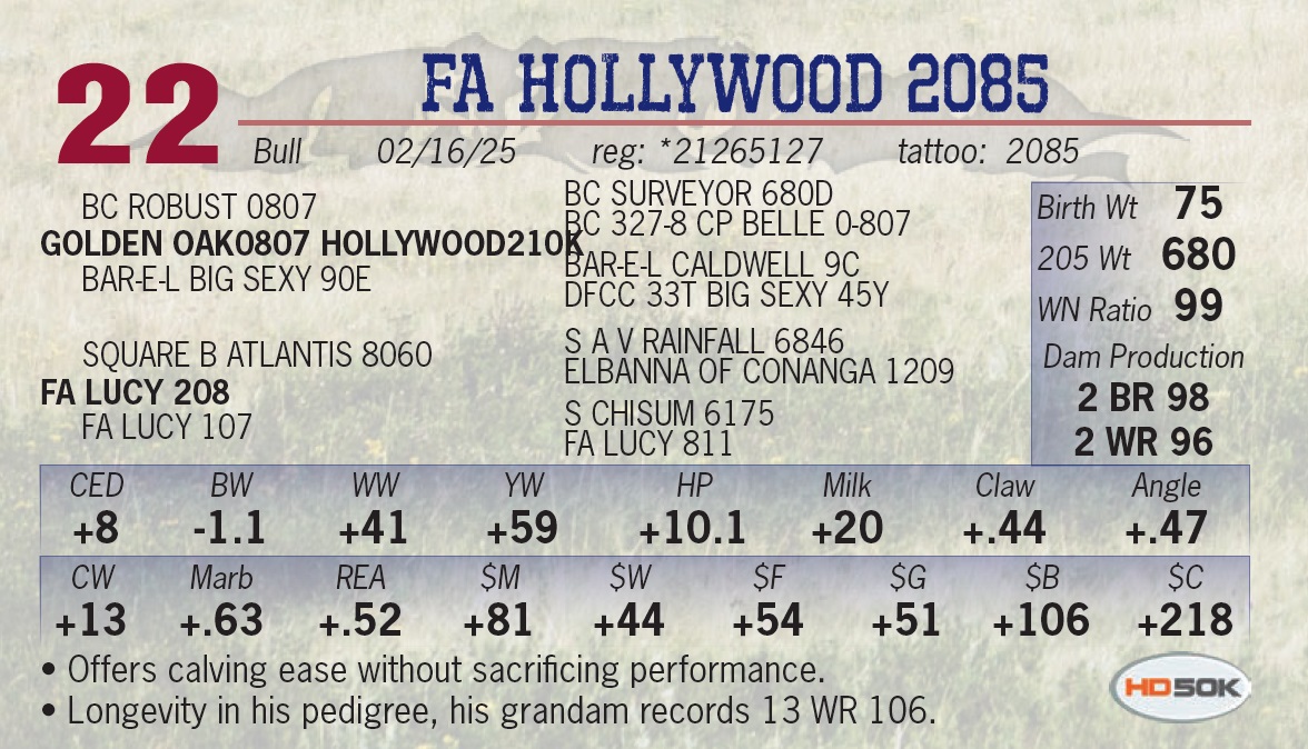 | FA HOLLYWOOD 2085 | 22 | Yearling Bull | • Offers calving ease without sacrificing performance. • Longevity in his pedigree, his grandam records 13 WR 106. |