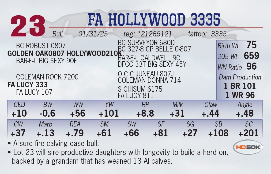| FA HOLLYWOOD 3335 | 23 | Yearling Bull | • A sure fire calving ease bull. • Lot 23 will sire productive daughters with longevity to build a herd on, backed by a grandam that has weaned 13 AI calves. |