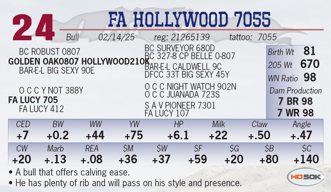 | FA HOLLYWOOD 7055 | 24 | Yearling Bull | • A bull that offers calving ease. • He has plenty of rib and will pass on his style and presence. |