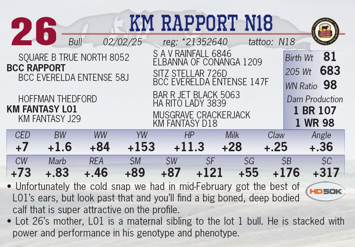 | KM RAPPORT N18 | 26 | Yearling Bull | • Unfortunately the cold snap we had in mid-February got the best of L01’s ears, but look past that and you’ll find a big boned, deep bodied calf that is super attractive on the profile. • Lot 26’s mother, L01 is a maternal sibling to the lot 1 bull. He is stacked with power and performance in his genotype and phenotype. |