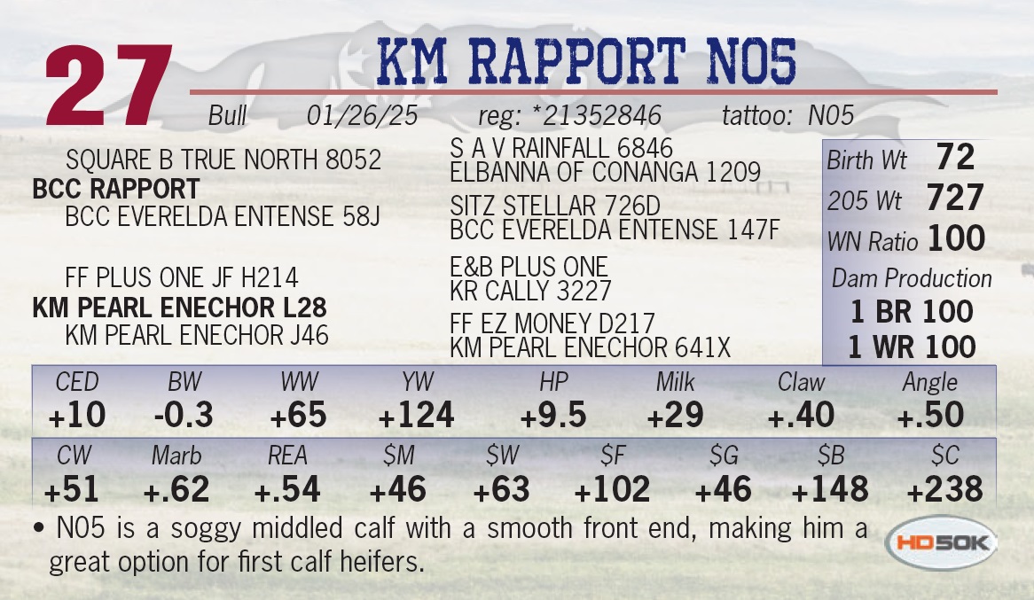 | KM RAPPORT N05 | 27 | Yearling Bull | • N05 is a soggy middled calf with a smooth front end, making him a great option for first calf heifers. |