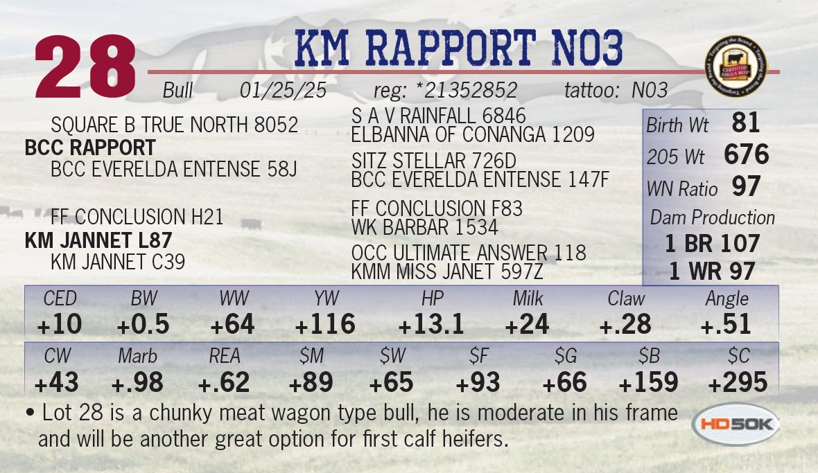 | KM RAPPORT N03 | 28 | Yearling Bull | • Lot 28 is a chunky meat wagon type bull, he is moderate in his frame and will be another great option for first calf heifers. |