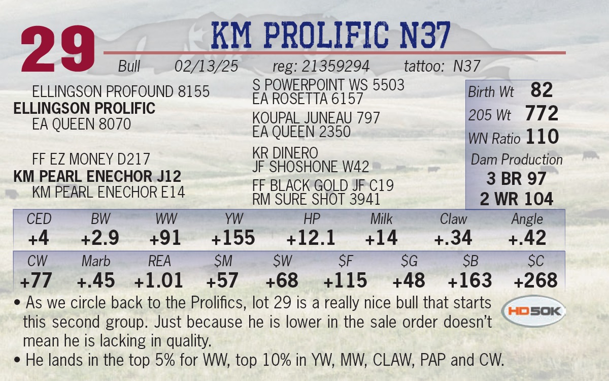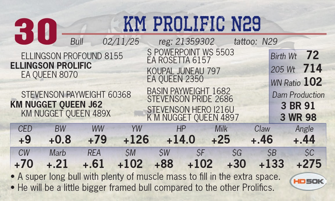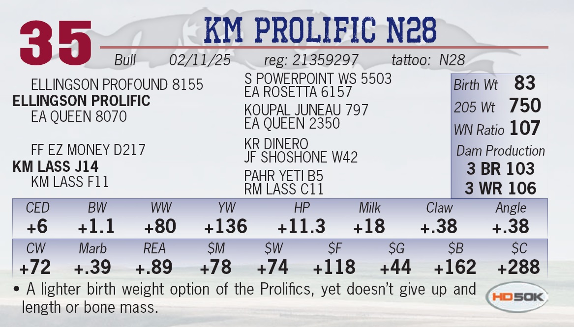 | KM PROLIFIC N28 | 35 | Yearling Bull | • A lighter birth weight option of the Prolifics, yet doesn’t give up and length or bone mass. |
