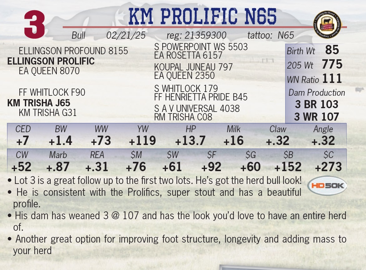 | KM PROLIFIC N65 | 3 | Yearling Bull | • Lot 3 is a great follow up to the first two lots. He’s got the herd bull look! • He is consistent with the Prolifics, super stout and has a beautiful profile. • His dam has weaned 3 @ 107 and has the look you’d love to have an entire herd of. • Another great option for improving foot structure, longevity and adding mass to your herd |
