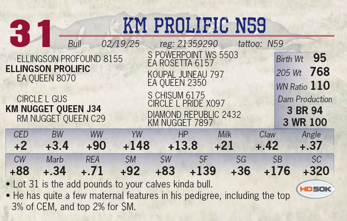 | KM PROLIFIC N59 | 31 | Yearling Bull | • Lot 31 is the add pounds to your calves kinda bull. • He has quite a few maternal features in his pedigree, including the top 3% of CEM, and top 2% for $M. |