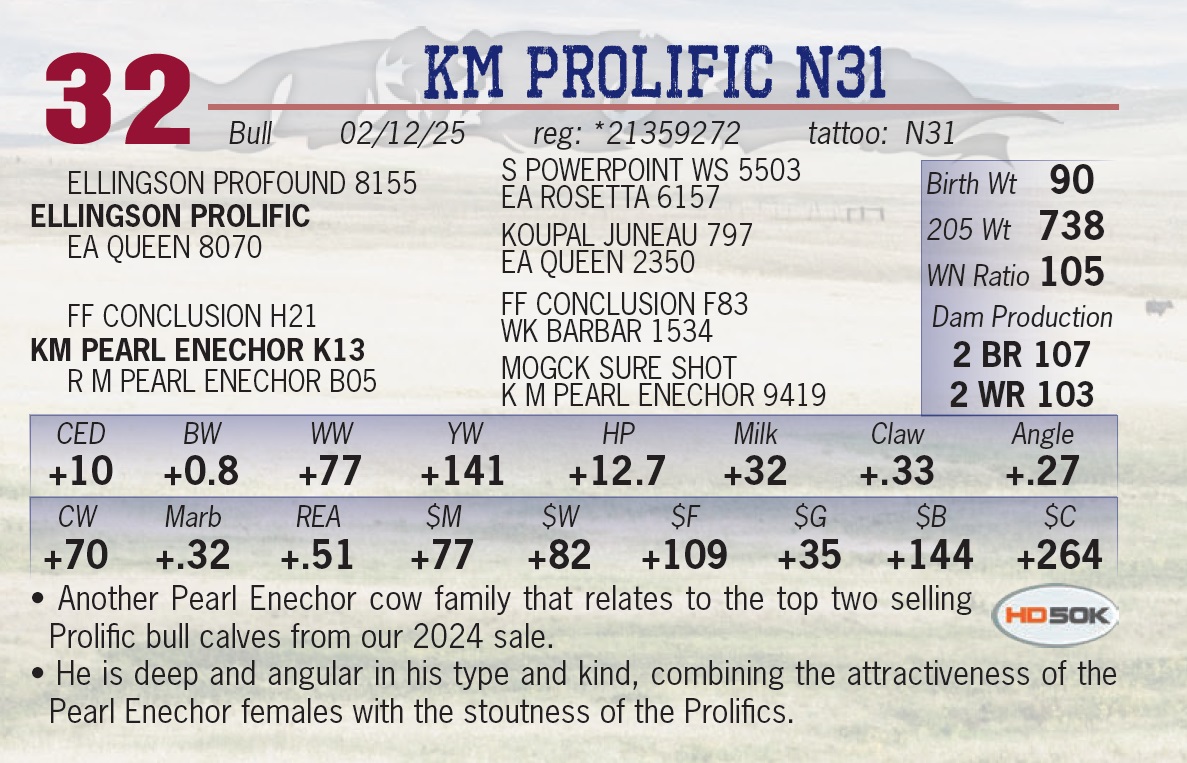 | KM PROLIFIC N31 | 32 | Yearling Bull | • Another Pearl Enechor cow family that relates to the top two selling Prolific bull calves from our 2024 sale. • He is deep and angular in his type and kind, combining the attractiveness of the Pearl Enechor females with the stoutness of the Prolifics. |