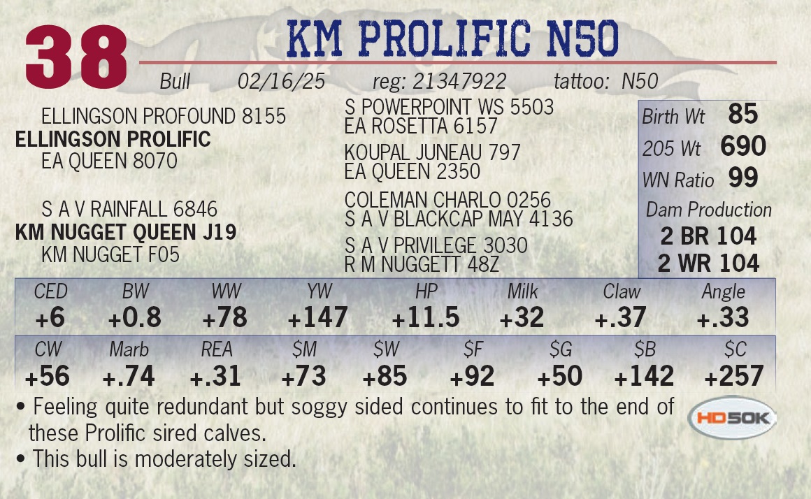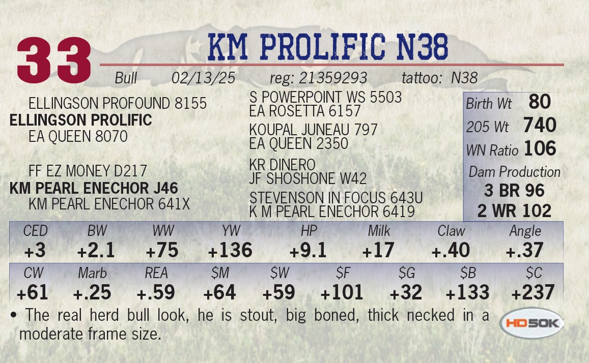 | KM PROLIFIC N38 | 33 | Yearling Bull | • The real herd bull look, he is stout, big boned, thick necked in a moderate frame size. |