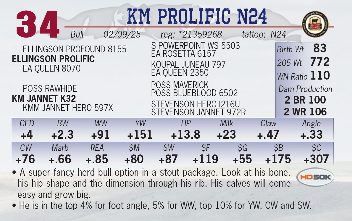 | KM PROLIFIC N24 | 34 | Yearling Bull | • A super fancy herd bull option in a stout package. Look at his bone, his hip shape and the dimension through his rib. His calves will come easy and grow big. • He is in the top 4% for foot angle, 5% for WW, top 10% for YW, CW and $W. |