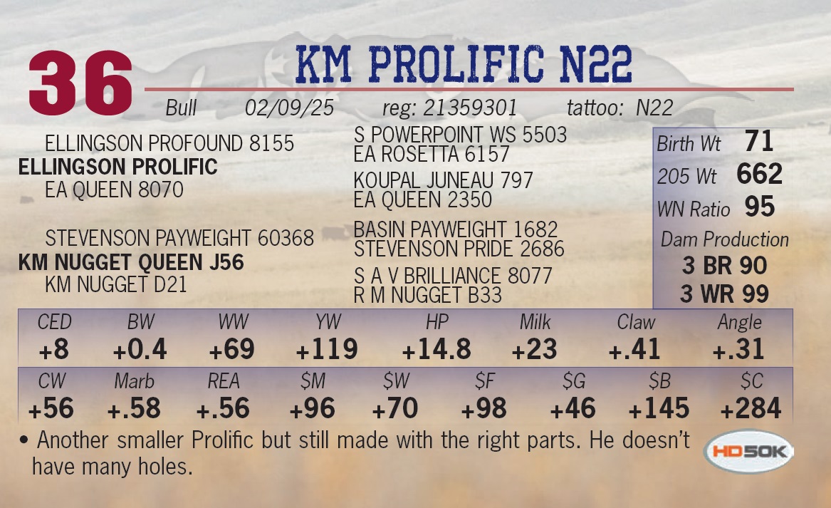 | KM PROLIFIC N22 | 36 | Yearling Bull | • Another smaller Prolific but still made with the right parts. He doesn’t have many holes. |