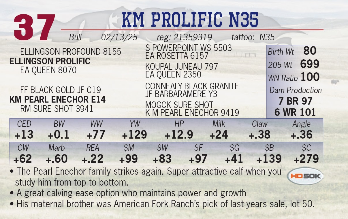 | KM PROLIFIC N35 | 37 | Yearling Bull | • The Pearl Enechor family strikes again. Super attractive calf when you study him from top to bottom. • A great calving ease option who maintains power and growth • His maternal brother was American Fork Ranch’s pick of last years sale, lot 50. |