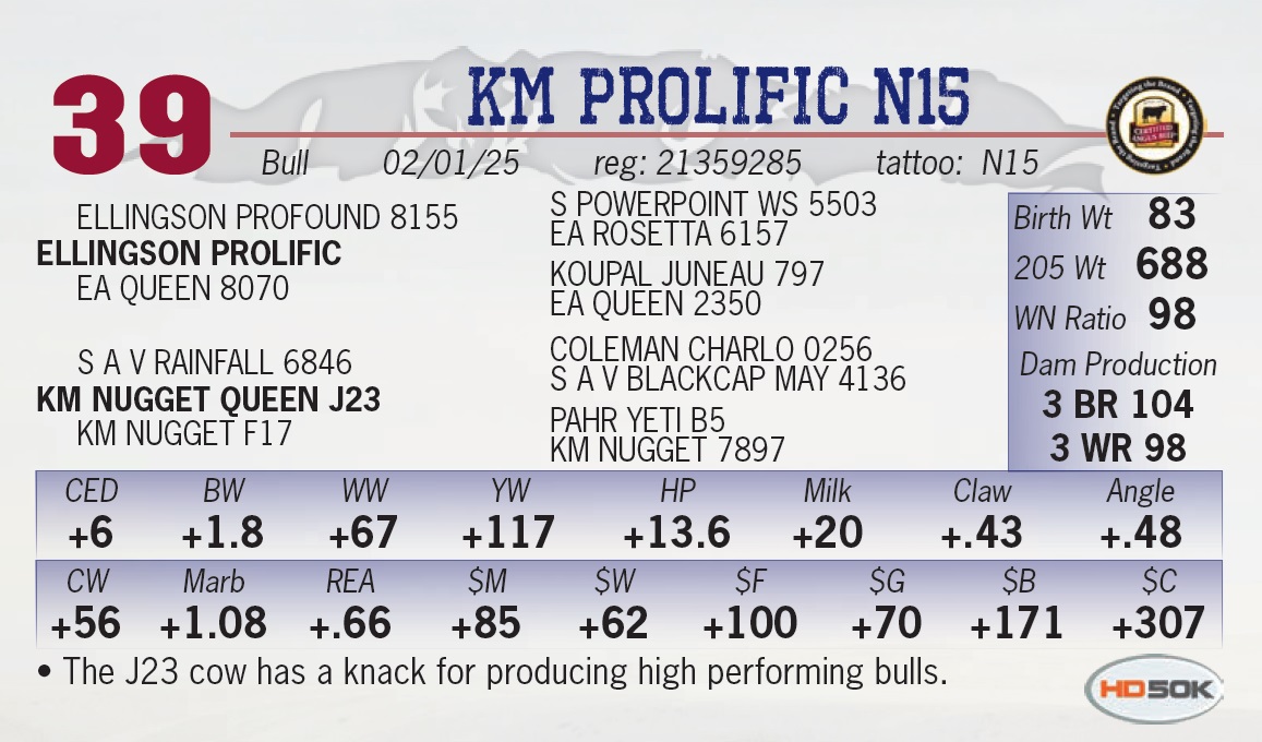| KM PROLIFIC N15 | 39 | Yearling Bull | • The J23 cow has a knack for producing high performing bulls. |