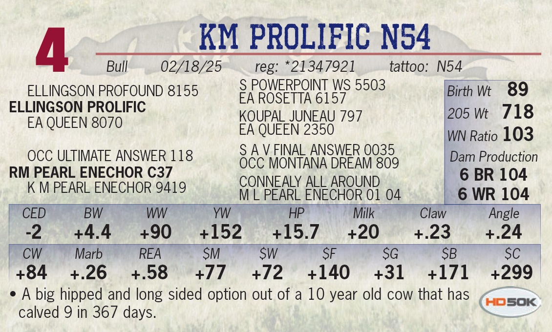 | KM PROLIFIC N54 | 4 | Yearling Bull | • A big hipped and long sided option out of a 10 year old cow that has calved 9 in 367 days. |