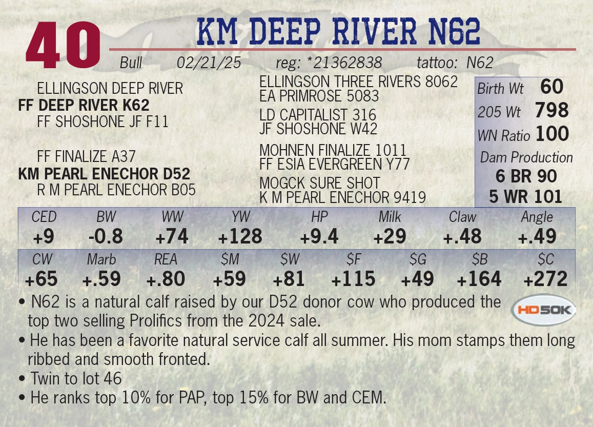 | KM DEEP RIVER N62 | 40 | Yearling Bull | • N62 is a natural calf raised by our D52 donor cow who produced the top two selling Prolifics from the 2024 sale. • He has been a favorite natural service calf all summer. His mom stamps them long ribbed and smooth fronted. • Twin to lot 46 • He ranks top 10% for PAP, top 15% for BW and CEM. |